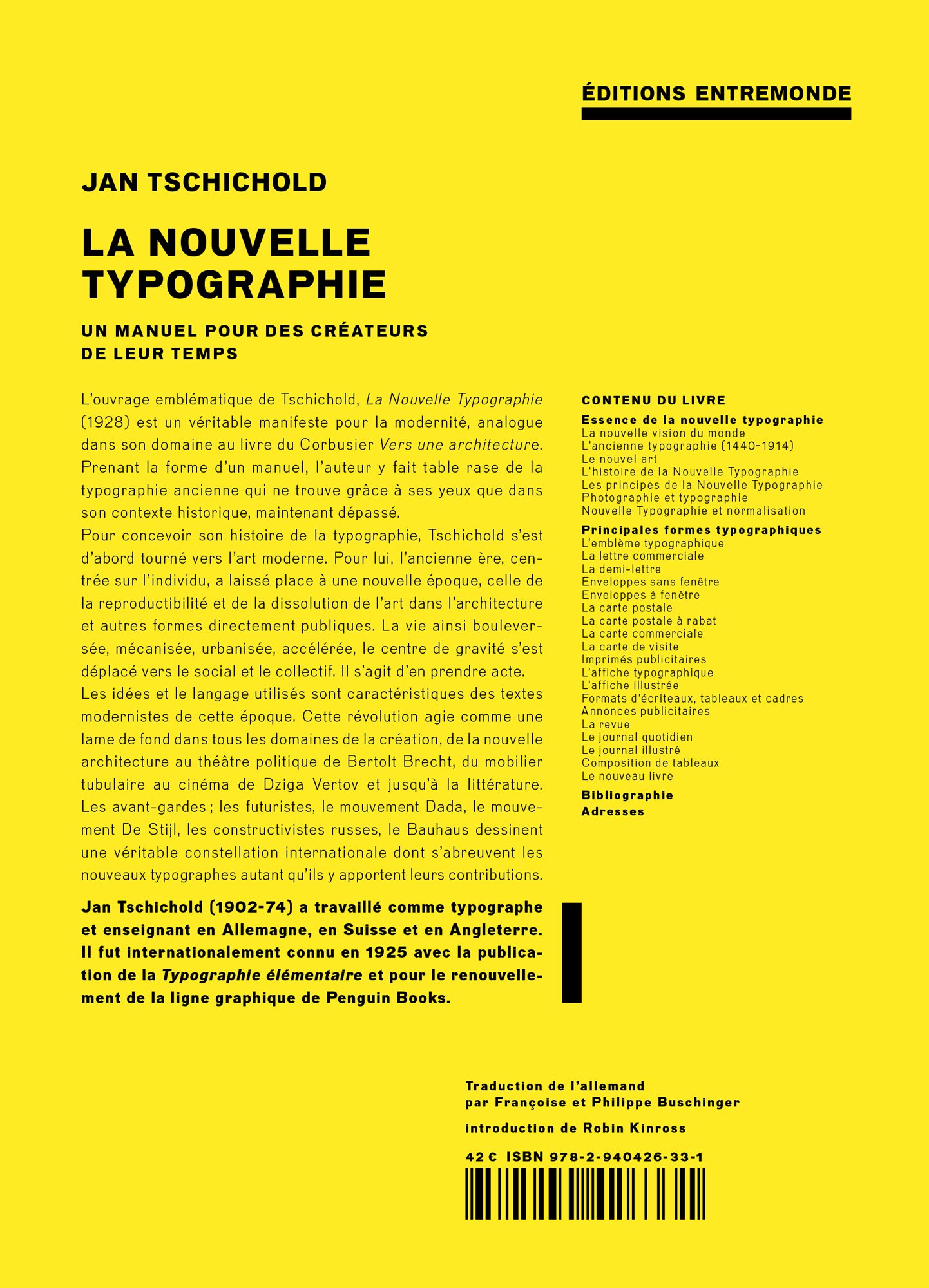 L’ouvrage emblématique de Tschichold, La Nouvelle Typographie (1928) est un véritable manifeste pour la modernité, analogue dans son domaine au livre du Corbusier Vers une architecture. Prenant la forme d’un manuel, l’auteur y fait table rase de la typographie ancienne qui ne trouve grâce à ses yeux que dans son contexte historique, maintenant dépassé.